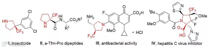 手性多取代四氢吡咯骨架广泛存在于天然产物、药物以及催化剂分子中,因此,发展这类骨架的构建方法引起广泛的关注。甲亚胺叶立德与烯烃的1,3-偶极环加成反应是构建多取代四氢吡咯骨架最直接简便的方法之一,然而,目前报道的方法仍然存在一些局限:催化剂负载量较大(至少5 mol%);较少采用廉价且稳定性好的金属催化剂前体;exo' 型选择性产物较少;由相同底物立体发散型合成不同立体构型产物的方法较少。