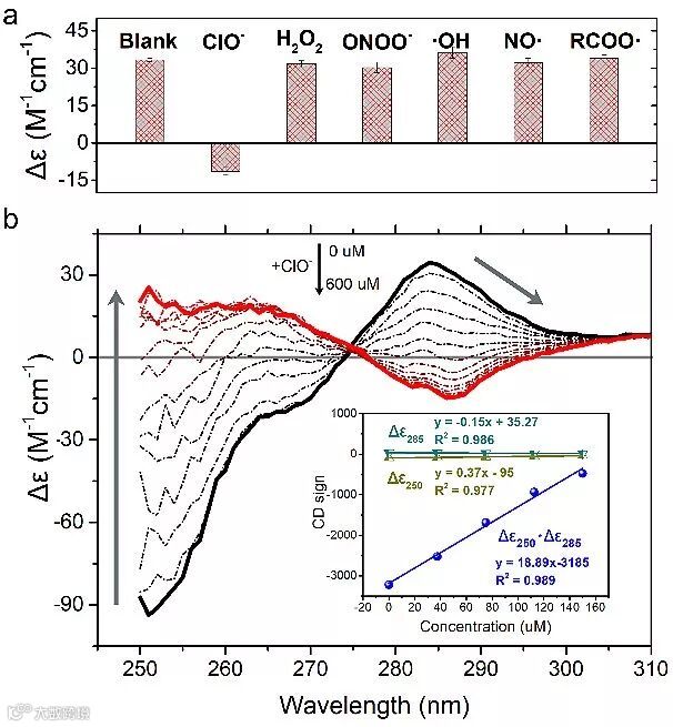 图3. 反应型手性探针对次氯酸的选择性响应引起CD光谱反转