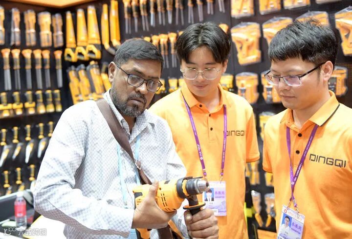 ▲10月19日,客商在广交会上了解一款电钻产品。(新华社摄)