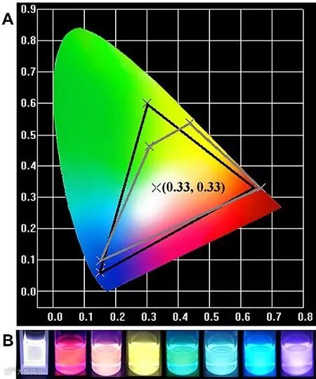 图3. A. CIE色坐标图:黑色三角形区域是sRGB色域,灰色四边形区域是CPSN的色域。B. CPSN的荧光照片的实例,包括纯白色光发射(0.33, 0.33)。