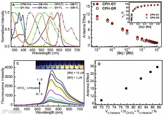 图2. A. CPH、GY、GR、GB的归一化的荧光发射光谱(虚线)以及其归一化的紫外吸收光谱(实线);B. CPSN的天线效应和能量转移效率(插图)与供体/受体比的关系;C. CPSN在不同溶剂比的CHCl3/环己烷混合溶剂中的荧光光谱;D. CPSN的天线效应与混合溶剂CHCl3/环己烷溶液比例的关系。