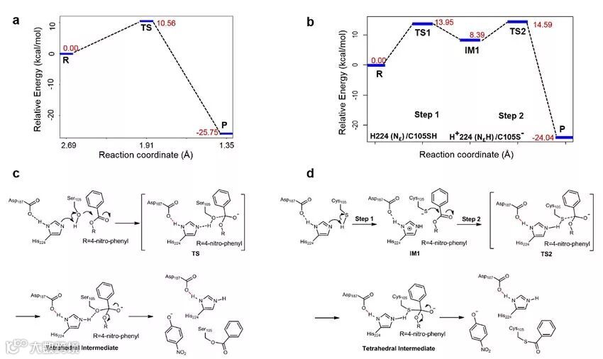 图3、CALB的丝氨酸突变体QW10(a,c)和半胱氨酸突变体QW4(b,d)不同的催化反应机理