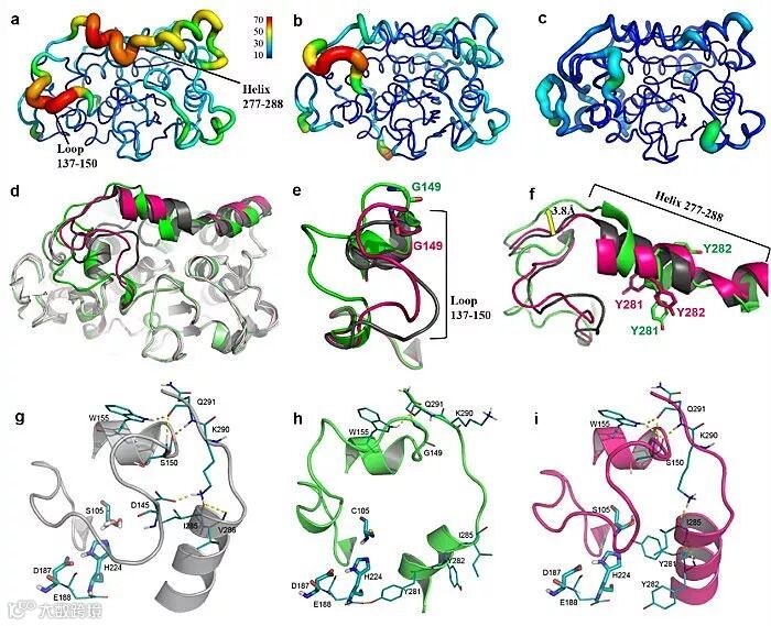 图2、野生型CALB(c & 灰色)、QW4(a & 绿色)和QW10突变株(b & 红色)的晶体结构对比