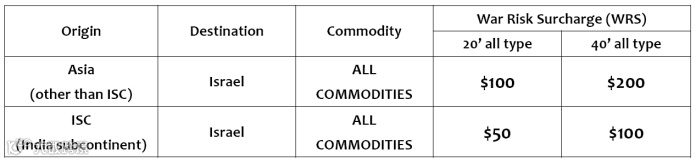 以星已决定对进出以色列的货物实施以下新的战争险保费 (WRP),自10月12日起生效。
