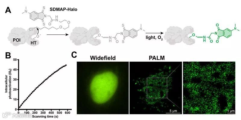 他们将这一类光活化荧光探针成功应用于超高分辨荧光成像。他们发现SNile Red可以很好的定位于细胞内的脂滴结构。并且由于它的光活化特性,SNile Red可以用于脂滴的超高分辨成像,成像精度高达13 nm。他们还证明这一类光活化荧光团能跟已有的商业染料联用,进一步丰富了他们的应用范围。并且这一广谱通用的光活化探针设计方法可以与蛋白靶向标记技术(Halo-Tag)联用,实现光活化探针在蛋白水平的靶向性。他们以组蛋白(Histone)为例,将组蛋白中融入Halo-tag短肽;在SDMAP上修饰Halo-Tag的反应底物(Halo 配体),得到了SDMAP-Halo。荧光共定位表明这个荧光分子能很好的靶向H2B-Halo-tag,并且实现了该蛋白的超高分辨成像。值得注意的是,该类荧光探针在用于超高分辨成像时可以直接在细胞培养基或者磷酸缓冲液中进行,并不需要引入任何对细胞有毒的还原剂或者氧气捕获剂,从而可以应用于活细胞的超高分辨成像,这一点相比起目前需要借助于还原剂或者氧气捕获剂来实现超高分辨成像的荧光探针具有显著的优势。