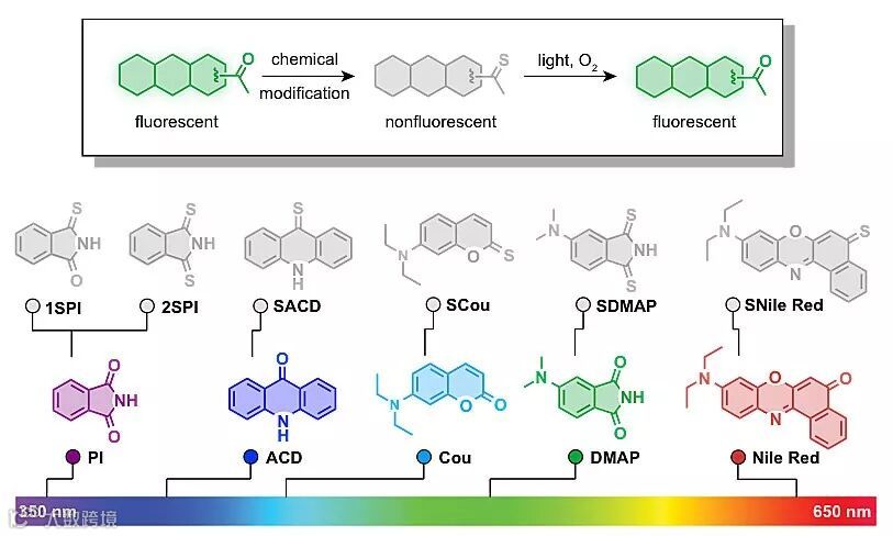 为了克服这一困难,在最新的JACS 研究成果中,莱斯大学的Han Xiao教授和他的团队仅仅通过一个从氧原子到硫原子的微小变化,就可以将现有的多种荧光团转变成能被可见光活化的荧光团。他们发现,将荧光团中的羰基通过劳森试剂转变成硫代羰基,就可以实现荧光团的荧光猝灭,使荧光团的量子产率降低至0左右。通过理论计算,他们发现这一类硫代羰基的荧光猝灭机制属于经典的光致电子转移引起的猝灭。在正常的有氧环境下,通过使用合适的光源照射(波长在荧光团吸收波长处的光源),硫代羰基可以很容易的氧化成正常的氧代羰基,荧光团恢复到正常状态,荧光得以恢复,从而实现可见光活化。