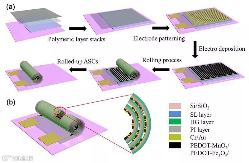 在过去的几年中,超级电容器储能材料的性能获得了大幅提升,集成多种功能的原型器件也不断被开发出来,但是由于缺乏相应的先进集成技术,MSCs的广泛应用受到了严重制约。近日,德国开姆尼茨理工大学(Chemnitz University of Technology)和莱布尼茨固体材料研究所(Leibniz IFW Dresden)的朱峰博士、Oliver G. Schmidt院士领导的课题组发展出一类“自组装集成管状微型超级电容器”。