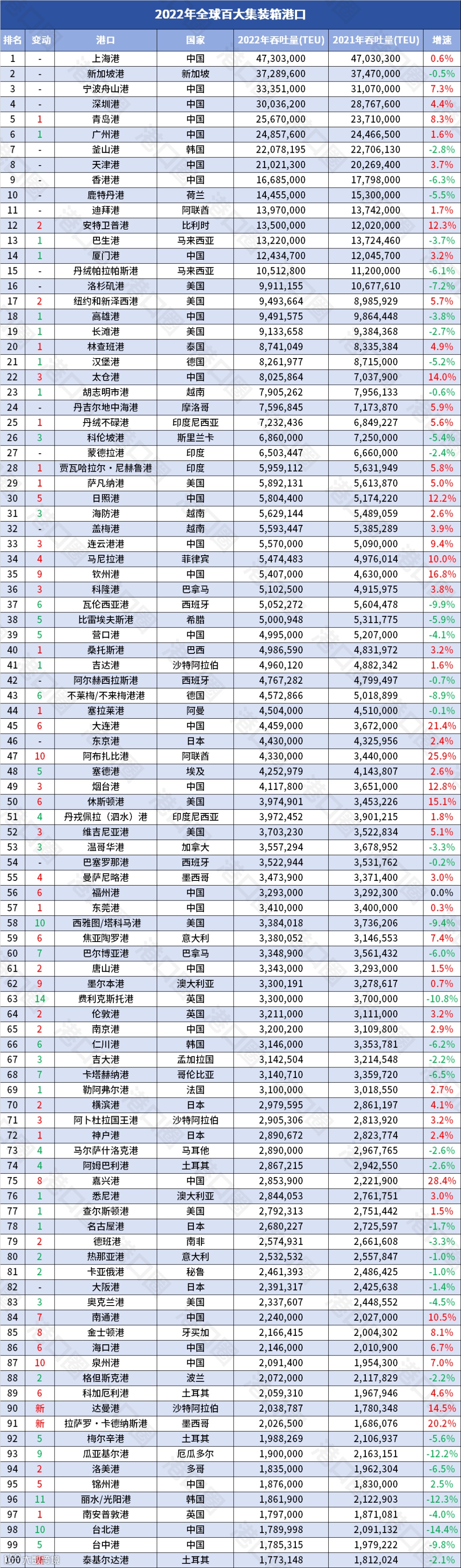 小总结:进入全球100大集装箱港口榜单的中国大陆港口有: