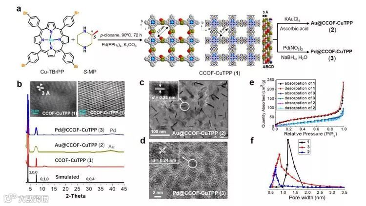 Fig. 1 Synthesis and characterization of 1-3. a Synthesis of 1-3. Single 2D layer and crystal packing patterns of 1. b Simulated and measured PXRD patterns of CCOF-CuTPP (1), Au@CCOF-CuTPP (2) and Pd@CCOF-CuTPP (3). TEM images (side and top views) of 1 were inserted. c and d TEM images of 2 and 3. Their SEM images are shown in Supplementary Figure 1. e N2 adsorption isotherms of 1-3 at 77 K. f The pore widths of 1-3 are centered at 1.20, 0.71 and 0.85 nm, respectively. 图片来自Nat. Commun.