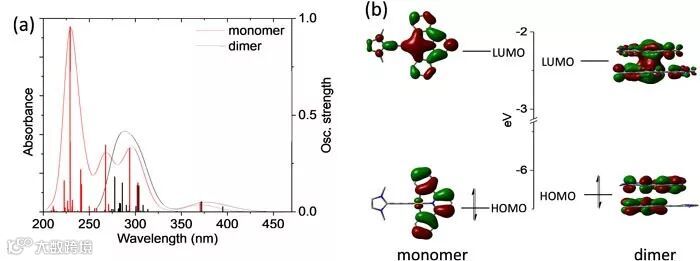 图3 (a)用TDDFT方法计算得到的单体3和二聚体[3]2的吸收光谱。(b)单体3和二聚体[3]2的分子轨道图