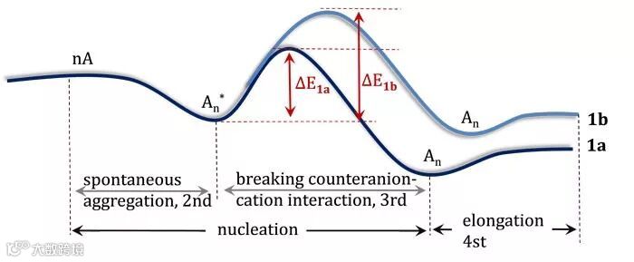 自组装的过程被分成了四步:步骤一,首先AuIII-阴离子配合物溶解于CH3CN或CH2Cl2有机溶剂中,并且被溶剂分子包围。在此阶段中,阴离子与金属阳离子有着紧密接触。步骤二,将不良溶剂(水或甲苯)注入到配合物的溶液(CH3CN或CH2Cl2)中时,有机溶剂笼被破坏,并且迅速形成动力学亚稳聚集态An*,被称之为“非活性核”。由于单体A和非活性核An*之间没有足够高的能垒,因此该过程发生的非常迅速。在该动力学亚稳态下,阴离子仍然与AuIII化合物具有相对紧密的接触。步骤三,通过破坏阴离子和金属阳离子之间的静电相互作用,使无活性核缓慢转变为“活性核”An。该过程高度依赖于阴离子,并且反应活化能受到金属阳离子和阴离子之间相互作用的影响。该转化过程也被认为是速率决定步骤。步骤四,如果溶液中存在过量的剩余单体,这些单体将在活化核的末端进一步聚集,这被称为伸长过程,如图5所示。