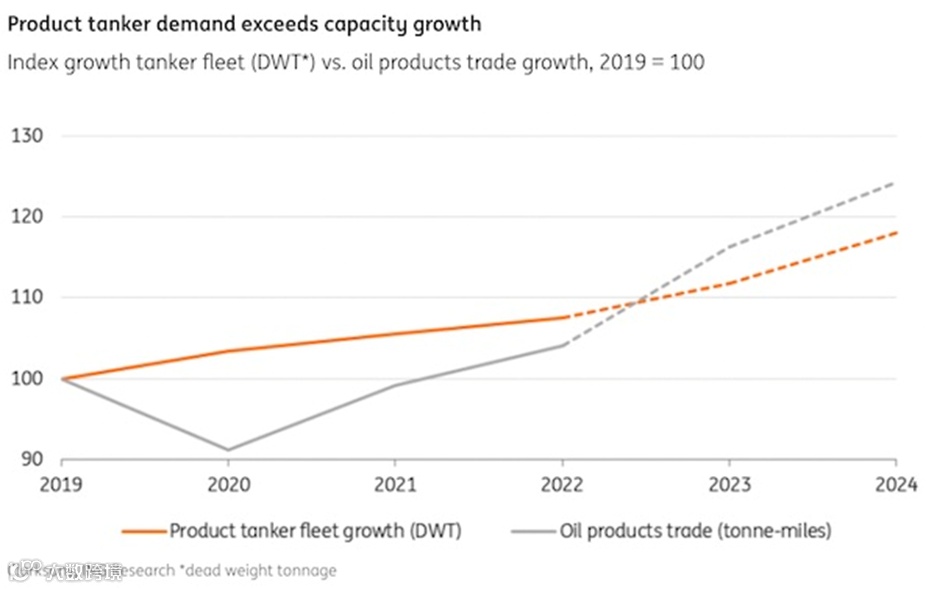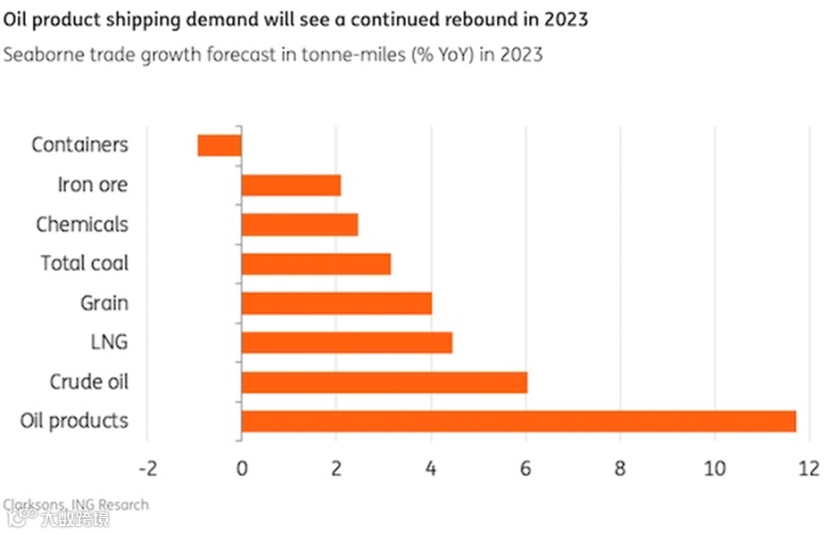 伯和美国进口更多原油,从印度进口柴油等成品油。这将推动2023年全球石油产品运输需求呈现两位数增长,而运力仅增长4%。同样,原油贸易将被推高,这对干散货运输(煤炭、铁矿石)的影响要小得多。