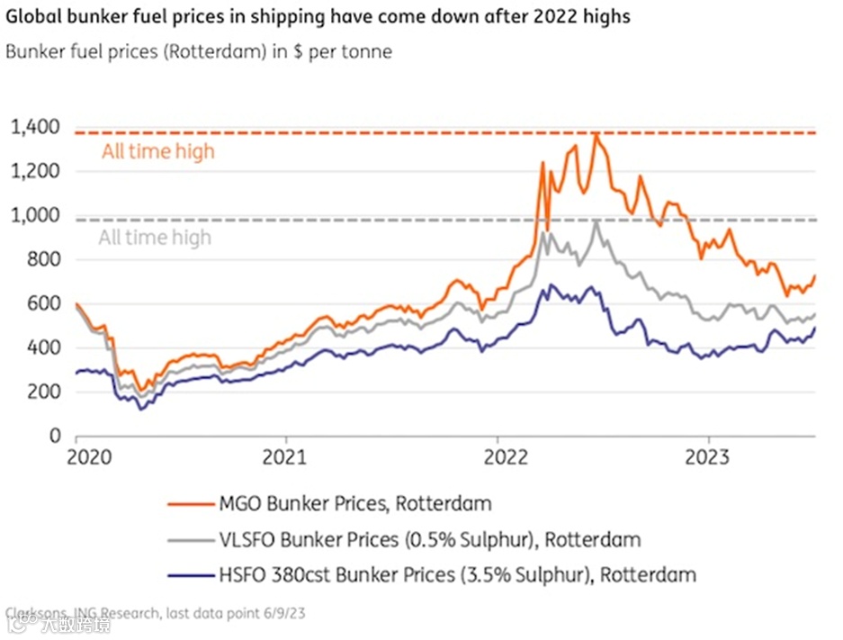 航运公司也面临着更高的总体成本,但最重要的成本部分已经下降。在大多数情况下,租船人支付燃料费用,但风险敞口也取决于合同安排,集装箱运输班轮公司通常支付燃料费用。与2022年相比,2023年上半年,重油(HFO)价格比去年同期低约30%。与去年相比,极低硫燃料油(VLSFO)和MGO下降幅度更大,导致燃料价差缩小。这使得安装脱硫塔变得不那么有吸引力。然而,石油市场仍然紧张,燃料价格风险仍然存在。