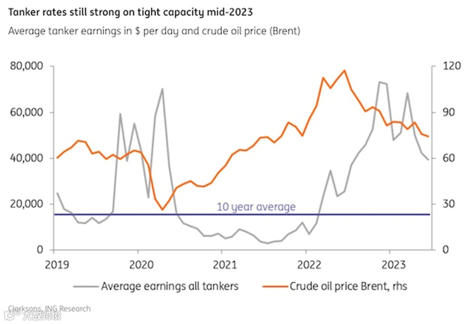 在俄乌冲突以及随后的制裁之后,油轮租金开始迅速上升。尽管此后有所下滑,但租金水平仍然相对较高,日租金达到40000美元,是10年平均水平的两倍多。目前,对俄罗斯实施的价格上限为船东带来了可观的溢价。基于当前紧张的市场基本而,油轮租金将保持强劲。