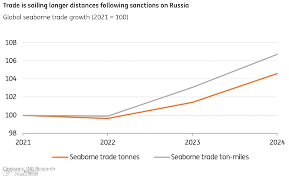 制裁后,航线的大规模重塑——导致了更长的航行距离。俄罗斯的石油、天然气、煤炭、铁矿石和金属贸易仍在进入市场,但流向了不同的买家。随着对俄罗斯的制裁分批生效,届时海运吨海里数预计将比去年同期增长3%以上,超过1%的贸易增长。由于制裁政策没有逆转的迹象,这些额外需求增量将在2024年延续。