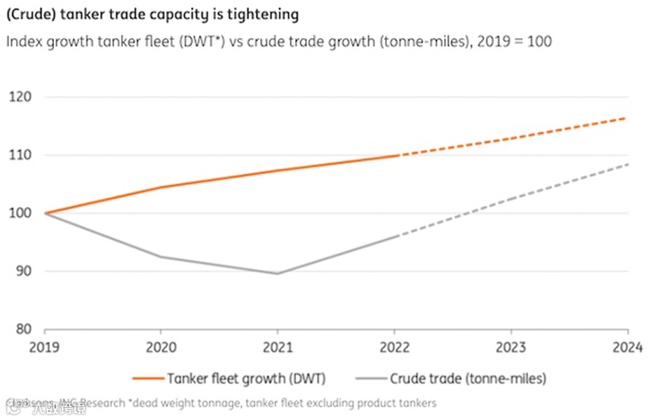 预计2023年全球石油消费将同比增长2%以上,今年上半年全球航空燃料消耗量飙升约30%。但最具影响力的是在对俄罗斯实施制裁后贸易航线的重塑。由于价格上限的实施,这导致船队的部署效率降低,并建立了一支由老旧油轮组成的大型“影子船队”。