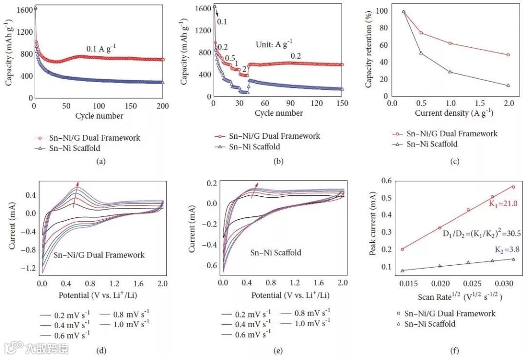 作为锂离子电池负极,双框架结构具有优异的稳定性和混合离子传输通道,同时,界面Sn–O–C键进一步稳定结构并加速电荷传输,因此,该Sn–Ni/G双框架材料表现出了良好的循环稳定性和倍率特性(图3)。在0.1 A/g的充放电速率下经过200次循环,其可逆比容量高达701 mAh/g;在1 A/g的大速率下,其平均比容量仍高达497 mAh/g。