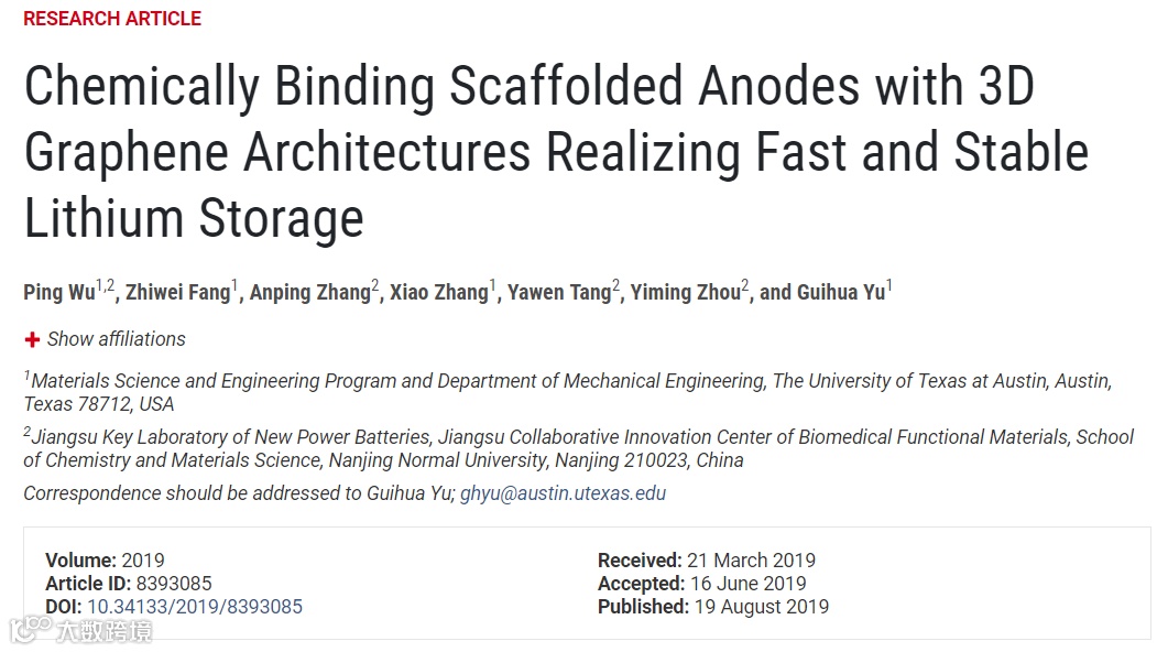 德克萨斯大学奥斯汀分校余桂华团队提出一种双网络凝胶还原策略,将框架结构合金负极材料与三维石墨烯相结合,形成物理交联与化学键合一体化的双框架材料,该石墨烯基双框架材料也因此表现出快速且稳定的储锂行为。相关成果以“Chemically Binding Scaffolded Anodes with 3D Graphene Architectures Realizing Fast and Stable Lithium Storage”为题发表在Research期刊上(Research, 2019, 8393085, DOI: 10.34133/2019/8393085)。