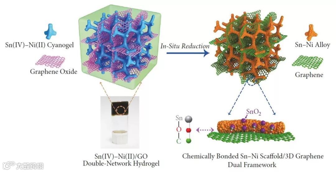 德克萨斯大学奥斯汀分校余桂华团队提出一种双网络凝胶还原策略,制备出物理交联且化学键合的一体化石墨烯基双框架材料用于高性能锂离子电池负极。以锡基合金负极材料为例,首先构建出由氧化石墨烯凝胶和氰基桥联(Sn–N≡C–Ni)配位聚合物凝胶(锡镍氰胶)组成的一体化双网络凝胶,进一步还原该凝胶可制得由Sn–Ni合金框架和三维石墨烯相互交织的Sn–Ni/G双框架材料(图1)。