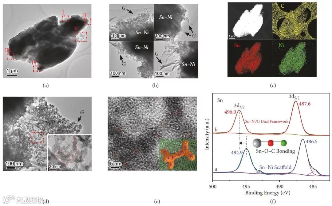 其中,Sn–Ni合金框架与三维石墨烯高度均匀分布,且无定形合金表面氧化物组分有利于两者之间形成强烈的Sn–O–C键,进一步增强储能应用中的协同作用(图2)。