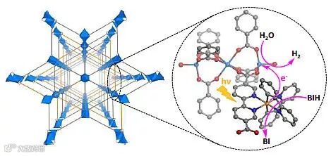 芝加哥大学化学系林文斌教授课题组最早以MOF为平台来研究人工光合作用(J. Am. Chem. Soc., 2011, 133, 13445-13454; Chem. Soc. Rev., 2014, 43, 5982-5993)。为了解决这一问题,最近,他们对采用MOF作为催化剂的载体构建进行了研究。主要通过向Ti3-BPDC骨架(BPDC =联苯-4,4-二羧酸)掺杂[Ir(ppy)2(dcbpy)]Cl或[Ru(bpy)2(dcbpy)]Cl2(bpy = 2,2-联吡啶,ppy = 2-苯基吡啶,dcbpy = 2,2-联吡啶-5,5-二羧酸)设计了两种新的钛基MOF(Ti3-BPDC-Ir和Ti3-BPDC-Ru)。光激发后的光敏剂可以将电子转移到次级结构单元(SBU)的钛氧簇上,进而发生析氢反应产生氢气。光敏配体和Ti3(OH)2 SBU的分级组装极大地提高了多电子转移的效率以及可见光催化析氢速率,Ti3-BPDC-Ir和Ti3-BPDC-Ru的产氢转化数分别为6632和786。