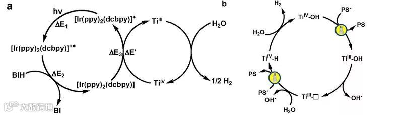 图3. a) 推测的光催化循环路径,b) 钛位点具体反应路径图