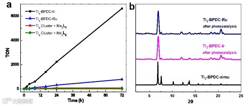 图2. a) 不同光催化剂催化产氢的时间跟踪曲线图,b) 反应后晶体粉末衍射图