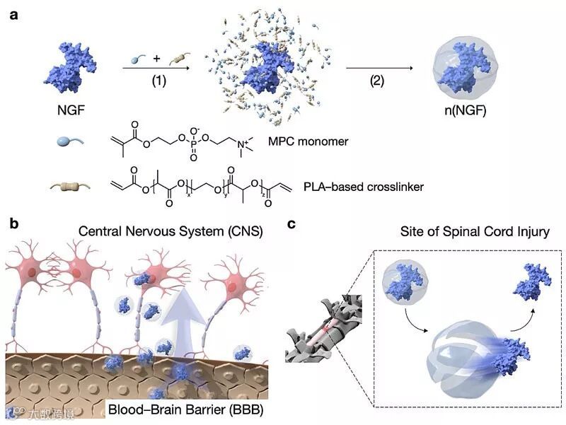 图1. NGF纳米胶囊的制备(a),CNS有效投递(b)与脊柱损伤部位的缓释(c)。