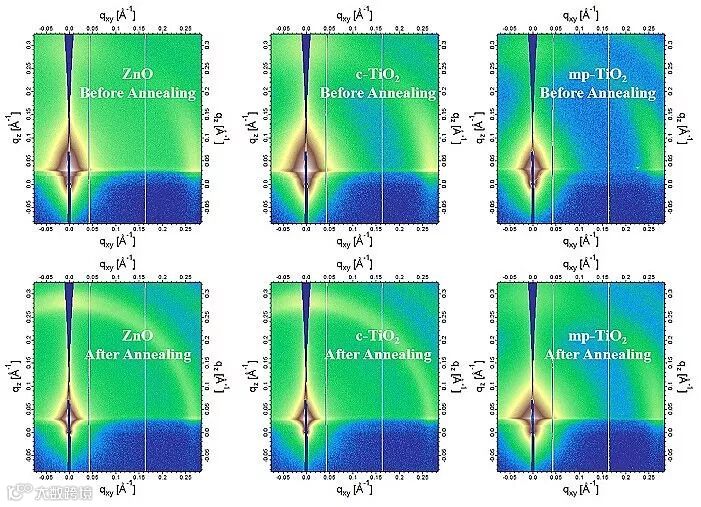 图5. 活性层材料在不同传输层上的热稳定测试前后的GIXD对比。图片来源:Matter