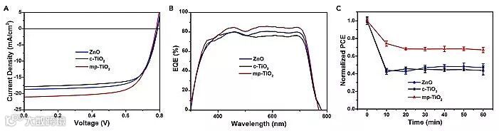 为了研究该“脚手架”结构ETL在有机太阳能电池中所扮演的角色,作者通过原子力电子显微镜以及扫描电子显微镜分别对平板氧化锌、平板氧化钛以及介孔氧化钛样品进行了测试。可以看出,无论平板的氧化锌材料还是平板的氧化钛材料都表现出连续且平滑的形貌,粗糙度都在1 nm左右。而相对的,介孔氧化钛的粗糙度在27.2 nm并且表面由一些小颗粒组成。这种形貌会增加与活性层之间的界面面积,从而可能提高电荷收集的效率。与此同时,这种介孔结构也在阻挡高温下活性层形貌变化的过程中起到关键作用。
