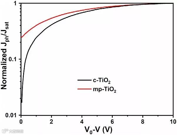 为了更好地理解有机太阳能电池效率的提高的原因,作者进一步对引入“脚手架”结构ETL的器件和平板结构的有机太阳能电池进行了载流子抽取和载流子收集的修正光电流测试。修正的光电流定义为器件在光照下和暗态的电流之差。如果所加的偏压足够大,那么可以认为所有的光生载流子全部都会被收集,也就是饱和电流。修正光电流与饱和电流的比代表着太阳能电池的载流子抽取和收集效率。该测试结果显示,基于介孔氧化钛结构的有机太阳能电池的修正电流优先饱和,显示出了更强的载流子抽取和收集能力,这与介孔传输层增加了电子传输层与活性层之间的界面面积相关。
