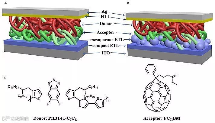 图1. (A,B)平板结构与“脚手架”结构对比;(C)活性层给受体的分子结构。图片来源:Matter