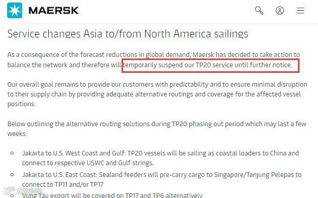 当时该公司还表示:“我们仍致力于通过Maersk Spot和Twill渠道运输所有与马士基签约的货物。一旦需求回升,我们就会恢复运力。”