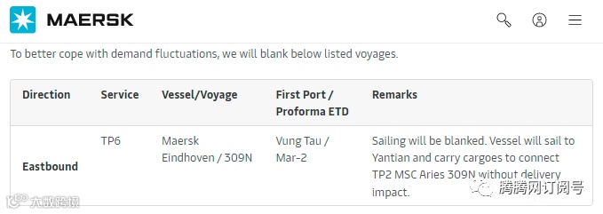 此外,2月16日,马士基发布通知,为了更好地应对需求波动,亚洲至北美的TP2执行一空白航行,该船将前往盐田并装载货物,在不影响交货的情况下连接TP2 MSC Aries 309N。