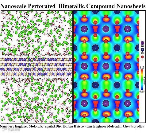 近期,华中科技大学翟天佑、刘友文与中国科学技术大学吴恒安团队合作,在纳米孔限域的双金属氢氧化物纳米片上实现了在乙醇电氧化过程中对乙醇分子的化学吸附和空间分布调控,促进了乙醇电氧化。他们将合成的MOFs超薄纳米片作为前驱体,利用其碱性环境下的不稳定性,合成了具有2 nm 孔的双金属氢氧化物纳米片,将其作为模型催化剂,研究了乙醇分子空间分布和化学吸附对乙醇电氧化性能的影响。其分子动力学模拟表明,当纳米孔尺寸大于2 nm时,纳米孔在乙醇电氧化过程中,扮演了“堤坝”的作用。此时,乙醇分子可以有效通过纳米孔,且呈现出在纳米孔周围积聚的倾向,增加了乙醇分子流动性及其与更多活性位点结合的能力,从而贡献了更有效的乙醇电氧化性能;此外,通过DFT理论计算、sXAS和XPS 表征,证明了杂原子的电荷转移行为能够调节活性位点周围的局部电荷密度,优化活性位点的亲核和亲电特性,促进了乙醇分子的化学吸附,导致了有效的乙醇电氧化性能提高。最后,使用具有2 nm 孔的CoNi双金属氢氧化物纳米片作为阳极催化剂,构建的杂化乙醇耦合水电解工艺也证明了析氢效率的有效提高。该工作在分子水平(即分子空间分布和化学吸附)洞察了穿孔纳米片对乙醇电氧化的影响,为探索其他小分子催化剂提供了新的研究思路。