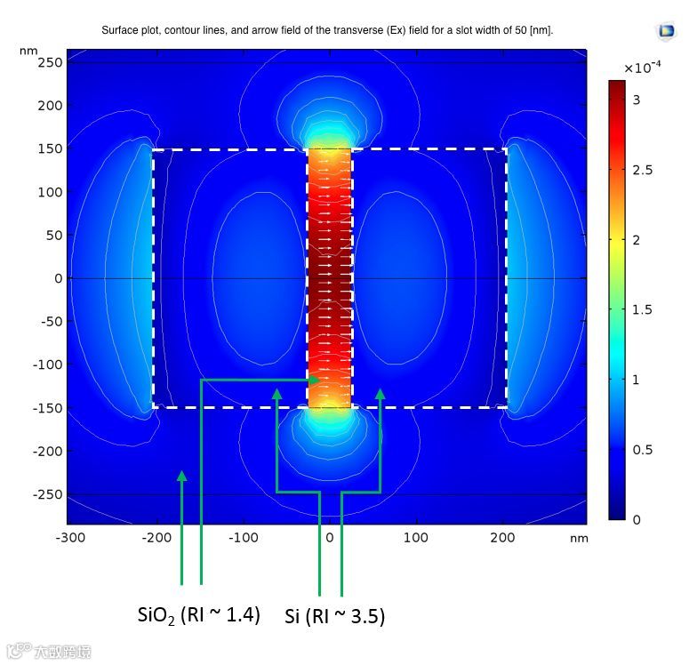 硅波导的关键在于折射率的高对比度,即相差约 50%。以前的技术依靠全内反射来限制能量,在这种情况下,能量被限制在被低折射率包层包围的高折射率纤芯中。然而,近年来的技术是限制与高折射率板相邻的低折射率狭缝中的能量,这有助于降低损耗。