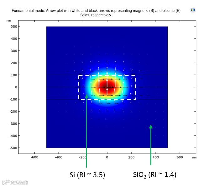我们可以使用 COMSOL Multiphysics 对硅波导的二维横截面进行模式分析(高折射率和低折射率两种情况),这样可以评估波导的有效折射率和基模,从而有助于我们理解归一化功率分布。