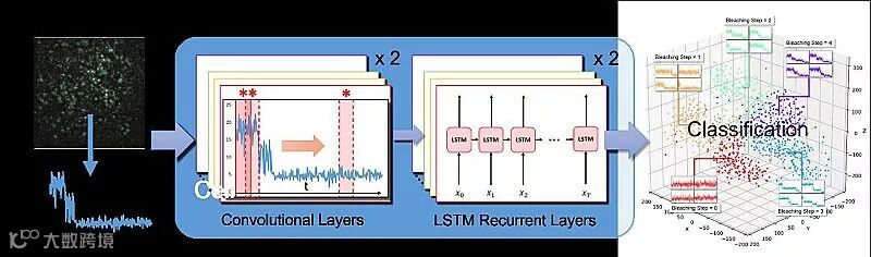 最近,他们针对单分子光漂白计数分析中检测信号弱、易被噪音掩盖和光闪烁干扰、数据量大等挑战性问题,巧妙地利用人工智能深度学习技术,提出了一个机器学习的深度神经网络架构——CLDNN,对单分子光漂白事件进行准确、高效计数。他们所设计的CLDNN可凭借其自身强大的学习能力以及特征提取能力,通过卷积层提取光漂白台阶信号,通过长短时记忆(LSTM)循环层排除荧光闪烁等干扰,实现90%以上准确率的化学计量比分析。相比于已报道的单分子信号分析方法,CLDNN具有诸多优势:(1)更高的分析准确率,尤其对于低信噪比的数据,优势更为明显;(2)更高的计算效率,可以快速处理大批量数据;(3)简单易用,无需对单分子数据做滤噪等预处理,也无需设置算法参数;(4)具有较好的推广性和扩展性,可对除训练水平外的不同信噪比数据以及包含更多光漂白事件的数据进行有效分析。此外,使用者也可以加入自己的实验数据集重新训练CLDNN,使其更加满足个性化分析需要。