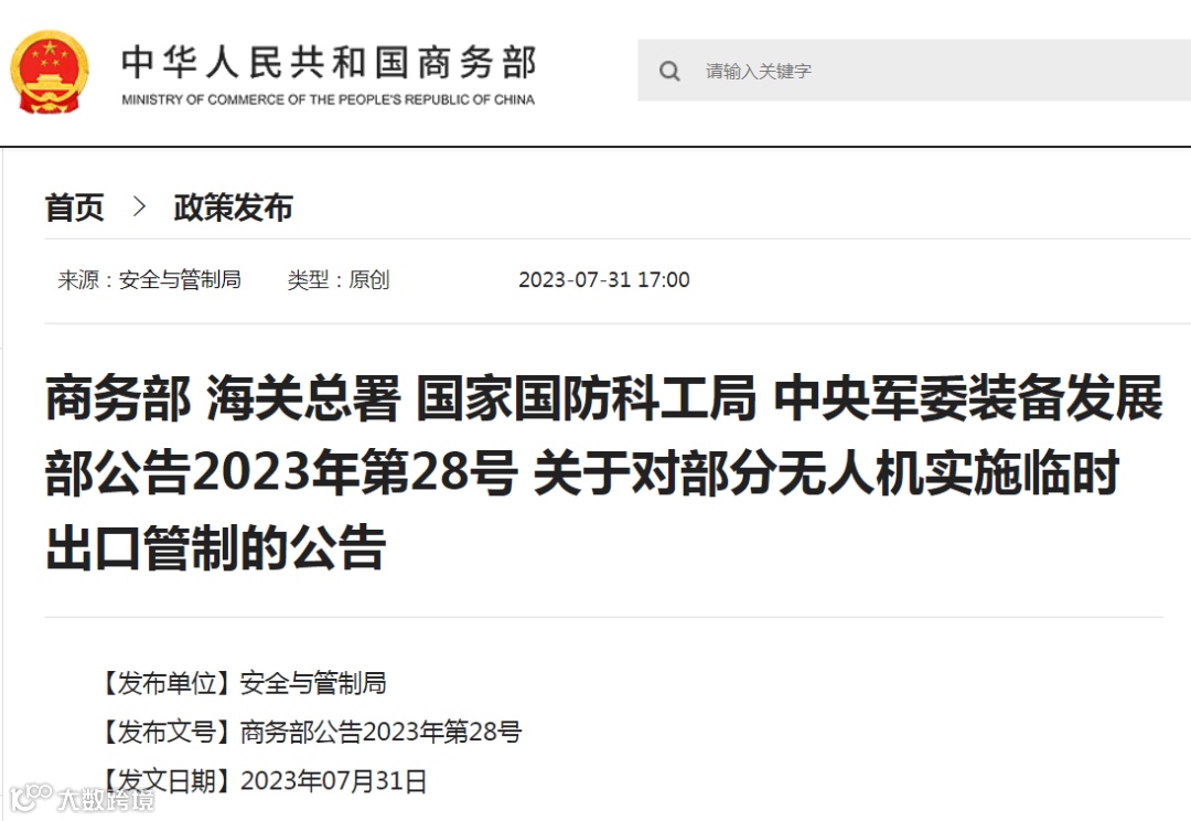 关于对部分无人机实施临时出口管制的公告