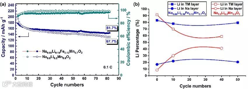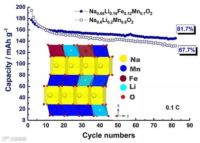 A:如上所述,我们的研究兴趣是着眼钠离子电池这一重要的能量存储器件技术,设计研究高效稳定的P2型钠离子电池正极材料,该类材料具有较高容量密度的优点,但其存在的缺陷是其材料结构在高电压范围内的充放电循环过程中材料结构不稳定,容易发生不可逆的P2-O2相变。在过去,人们已经报道了许多关于采用了Li掺杂的策略以提高P2型层状氧化物正极的电化学循环稳定性,但都未进行深入探究材料结构中所掺杂的Li在长期循环过程中发生的变化。鉴于此,我们深入研究了掺杂Li在电化学循环过程中变化与其容量衰减的关联性,并在Na0.6Li0.2Mn0.8O2材料中发现在长期循环过程中Li 的流失对其容量保持率有重要的影响。在这一发现的驱使下,我们进一步设计并制备了Na0.66Li0.18Fe0.12Mn0.7O2这一材料,以达到高容量和高循环稳定性的钠离子电池正极材料。