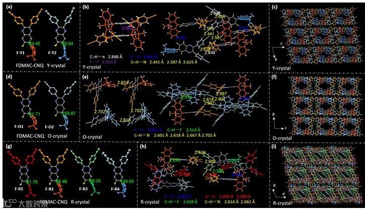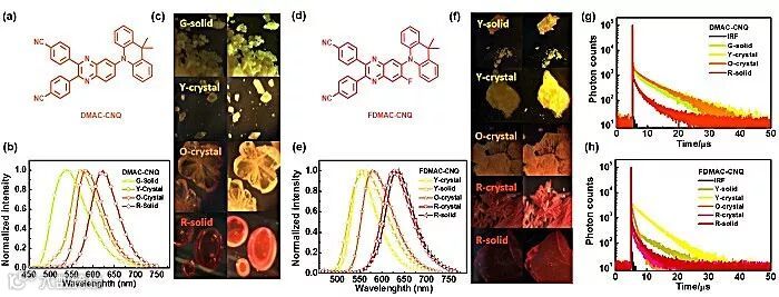 近日,武汉大学/深圳大学杨楚罗教授团队报道了以9,9-二甲基-9,10-二氢吖啶(DMAC)为电子供体,氰基苯基喹喔啉为电子受体的两个多功能有机分子DMAC-CNQ和FDMAC-CNQ。二者于溶液中表现出AIE和TADF性质,粉末态时呈现多色MCL和TADF特征,晶态时表现出同质多晶依赖的TADF特征。通过同质多晶的单晶结构分析,该工作揭示了不同聚集态与其TADF特征的关系。