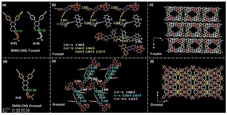 两个分子在粉末态时表现出多色力致变色性质。其初始状态下的黄绿色(或橙色)固体,经研磨后表现出红橙光发射,再经二氯甲烷熏蒸后又可以恢复至黄色发光,且经不同处理的固体均表现出典型的TADF发射。粉末衍射数据显示这一过程经历了微晶态—无定形态—微晶态的转变。同质多晶现象为进一步探究聚集态和TADF性质提供了独特的视角。每种聚集态都表现出不同的TADF发射波长、寿命和发光效率。单晶衍射数据显示二者结构具有多重易变构象,且含有多种形式和作用强度的分子间作用力。DMAC更加扭曲的构象具有更高的激发态,常出现在黄色单晶结构中;分子间存在较多而且较强的π-π作用则会导致光谱的红移和发光效率的降低。从分子水平到聚集态:分子结构决定了TADF的特性,聚集态中不同的构象和分子间作用方式进一步影响了发射波长、寿命和发光效率。