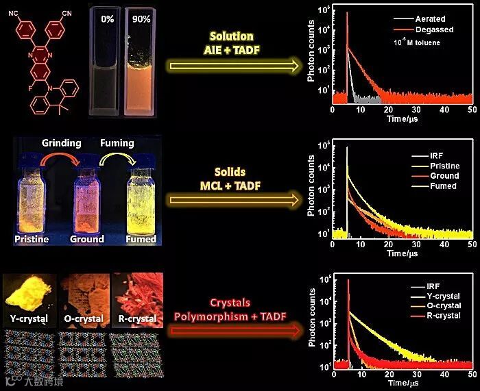 近年来,具有聚集诱导发光(AIE)、热激活延迟荧光(TADF)、力致变色(MCL)、同质多晶等性质的有机发光材料引起了人们的广泛关注。然而,同时具备上述发光特性的有机多功能材料却极为罕见。其中,TADF材料因其在有机发光二极管(OLEDs)和时间分辨成像等领域的广泛应用而备受瞩目。当前,对TADF材料的研究主要集中在分子水平,其聚集态行为有待深入研究。