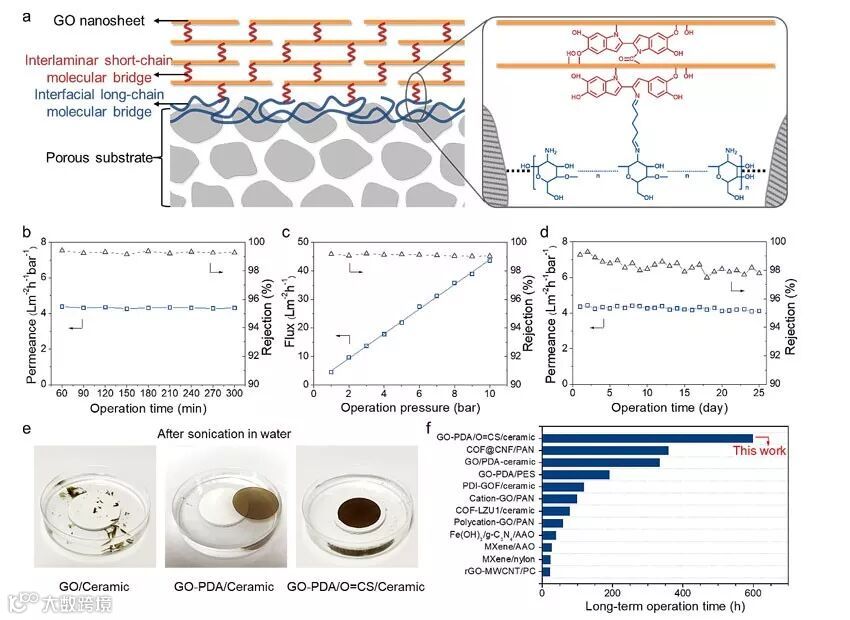 图1. a)构筑层间短链分子桥与界面长链分子桥制备结构稳定的GO膜;所制备的GO膜在b)高压、c)错流、d)25天长期过滤实验中都能保持良好的分离性能;e)长、短链分子桥的引入显著提高了GO膜在水中的结构稳定性;f)该工作报道的GO膜稳定性优于文献其他二维材料膜。