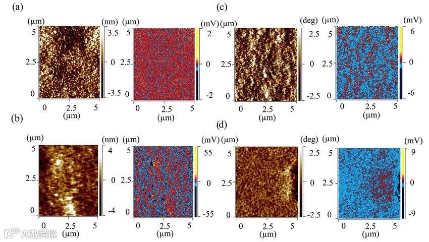 共混体系中材料相分离微观结构对体系性能起到重要作用。AFM结合傅里叶变换红外光谱测试显示,不同BPE添加含量的共混体系皆呈现均匀的微区域相分离现象,无明显的单组分团聚现象,保证了体系的导电性能。