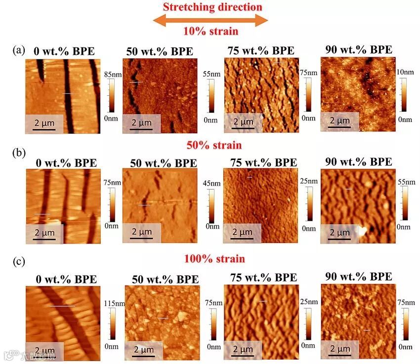 BPE共混膜不同应变条件下生成表面裂纹形貌表征。图片来源:Macromolecules