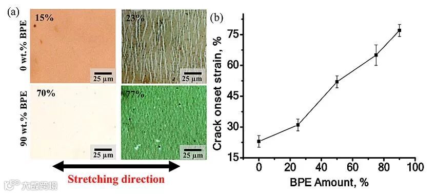 在共混体系中BPE起到增塑剂作用,且利于共轭聚合物呈无定型形态。在宏观尺度,随着体系中BPE含量的增加共混体系柔韧性线性增加。当BPE添加量为90 wt %时共混体系初始裂纹诱发应变从初始23%提升至75%。在70%高应变应用条件下能够保持共混膜表面无裂纹缺陷。