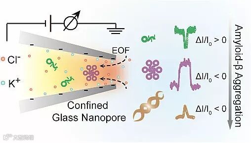 Researchers from China have developed a glass nanopore based single molecule tool to investigate the dynamic oligomerization and aggregation process of Aβ1–42 peptides. The differences in molecular size and surface charge of amyloid aggregated states are distinguished through single molecule induced characteristic current fluctuation. The study reveals that the neurotoxic Aβ1–42 oligomer tends to adsorb onto the solid surface of nanopores, which may explain its instability and highly neurotoxic features.
