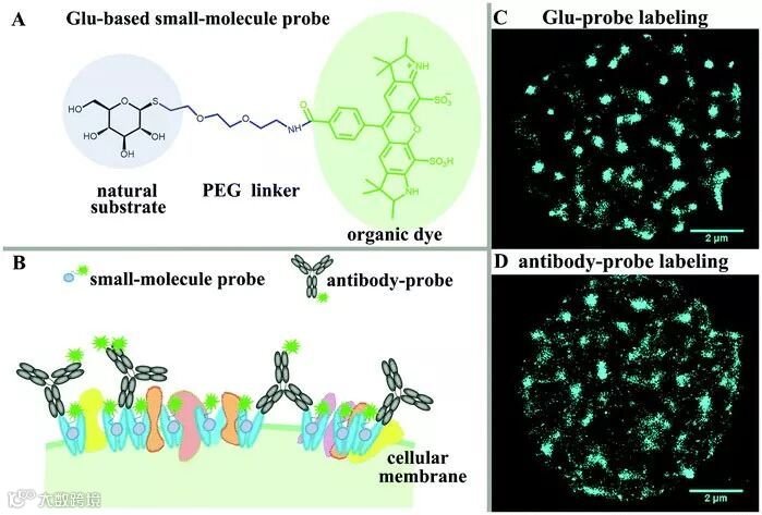 High-quality fluorescent imaging requires highly accurate labelling. To achieve this probes must efficiently and specifically deliver bright fluorophores into close proximity of the targeted molecules with a low background. Natural substrates are small and have high specificity to their specific transporters, so this work utilises select small substrates to recognize membrane transporters. The substrates were modified and coupled to a fluorescent dye with a PEG linker to form a small probe. Compared with traditional antibody probes the synthetic probes are quite small, which allows higher labelling density. Based on chemo-selectivity of an organic reaction, one substrate is coupled to only one organic dye, which is beneficial to more accurately display the distribution of targets. With this probe labelling, the organization of membrane transporters were characterized.