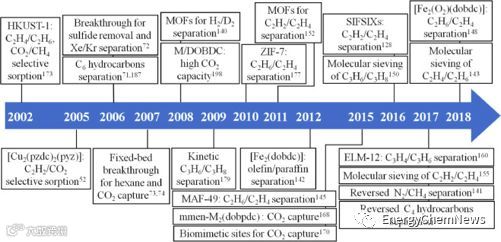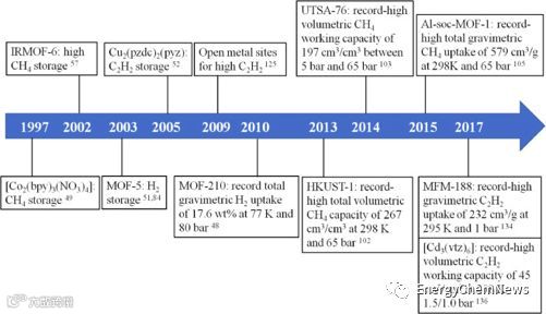 Figure 1. Timeline of important breakthroughs in gas storage using MOFs.